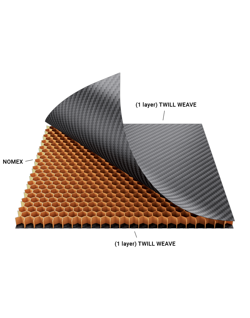 Carbon Honeycomb Panels with Nomex core (industrial type C2), manufactured with precision and craftsmanship in the Netherlands. These lightweight panels offer very high specific stiffness due to the combination of carbon fiber and honeycomb core material. The surface has a matte appearance and a 3k twill weave structure. The strength distribution of the panel is 50°-50° in both longitudinal and transverse directions.