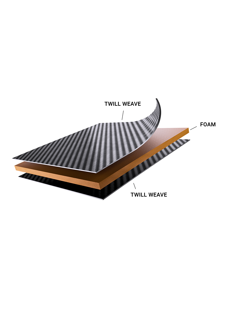 These carbon sandwich panels are super light and rigid. The panels are composed of a core of closed-cell hard foam, which is covered on both sides with 2 layers of twill carbon fabric. The thickness of the panel has a tolerance of +/- 0,5mm. The foam core may have a partial seam, which is very slightly marked on the surface. This has no mechanical consequences.